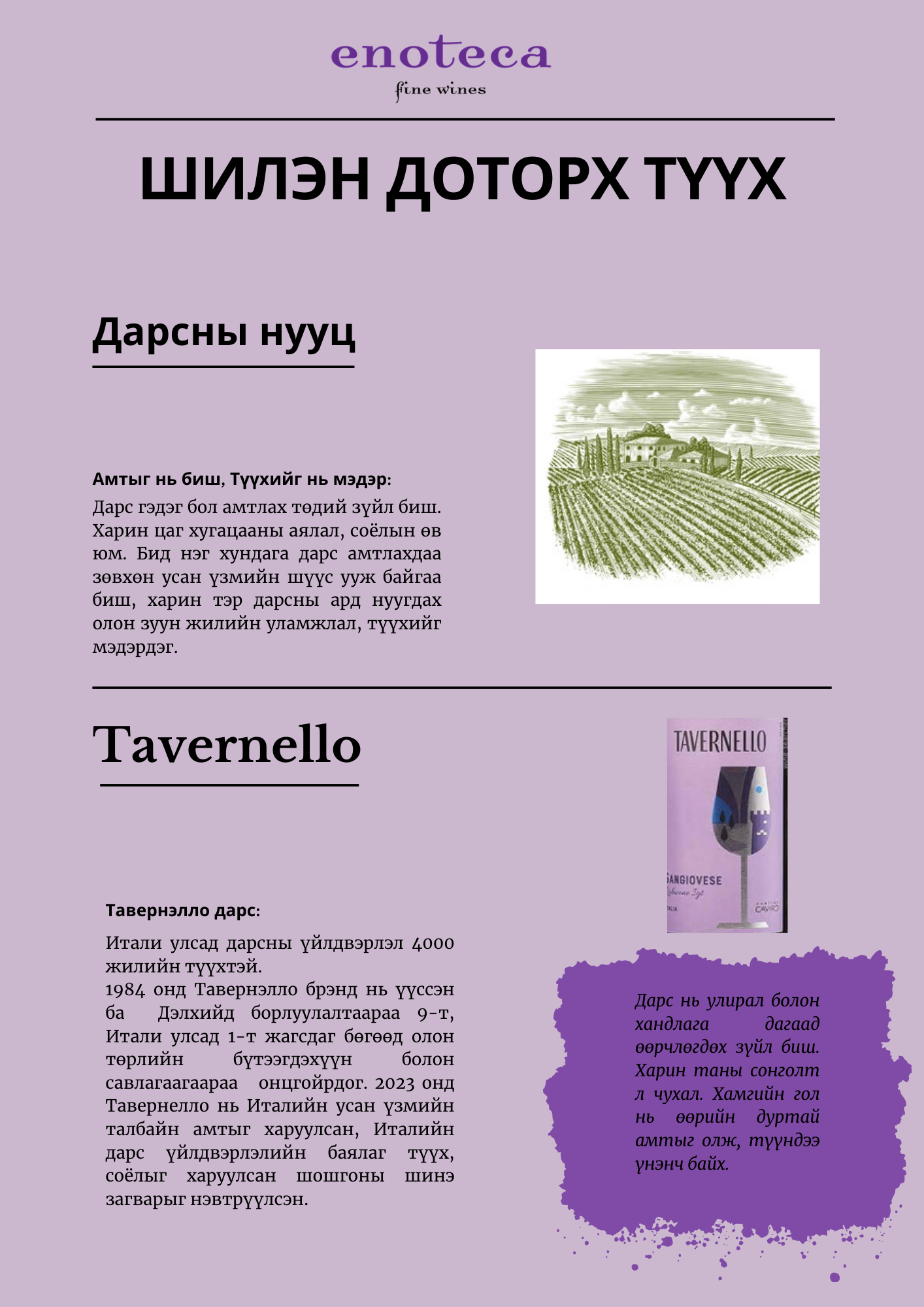 Tavernello дарсны нууцАмтыг нь биш, Түүхийг нь мэдэр.Дарс гэдэг бол амтлах төдий зүйл биш. Харин цаг хугацааны аялал, соёлын өв юм. Бид нэг хундага дарс амтлахдаа зөвхөн усан үзмийн шүүс ууж байгаа би